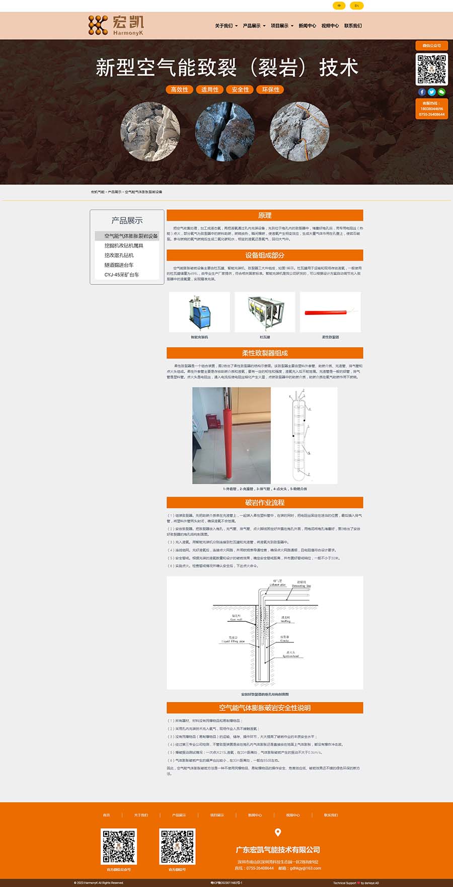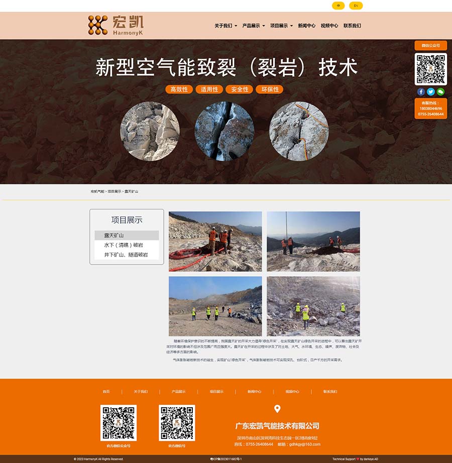 廣東宏凱氣能技術(shù)有限公司是國家高新技術(shù)企業(yè)深圳宏業(yè)基巖土科技股份有限公司子公司,坐落在深圳市南山區(qū)粵海街道高新區(qū)社區(qū)沙河西路1809號深圳灣科技生態(tài)園2棟B902,注冊資金1000萬人民幣。公司專注于氣能相變裂巖技術(shù)與相關(guān)設(shè)備的創(chuàng)新研發(fā),承攬露天礦山、基坑開挖、城市市政、道路擴建、地鐵隧道掘進及水下礁石清理等靜態(tài)氣體膨脹破巖工程。公司開發(fā)的新型氣能破巖技術(shù)擁有核心專利技術(shù)40余項,參與起草制定行業(yè)標(biāo)準(zhǔn),企業(yè)標(biāo)準(zhǔn),其技術(shù)處于國內(nèi)外領(lǐng)先水平,并獲得中國爆破行業(yè)協(xié)會科技進步二等獎。